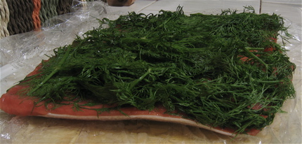 Trim dill so that it is roughly the same length as the filets. Mound dill on top of one filet in an even layer, then top with other filet so that the flesh is in contact with the dill (think filet & dill sandwich). Wrap the stacked filets tightly in a double or triple layer of plastic wrap. Place in a dish (to catch any juices that should leak out), then refrigerate for 2-3 days, flipping occasionally, and pouring off any juices that might have accumulated.